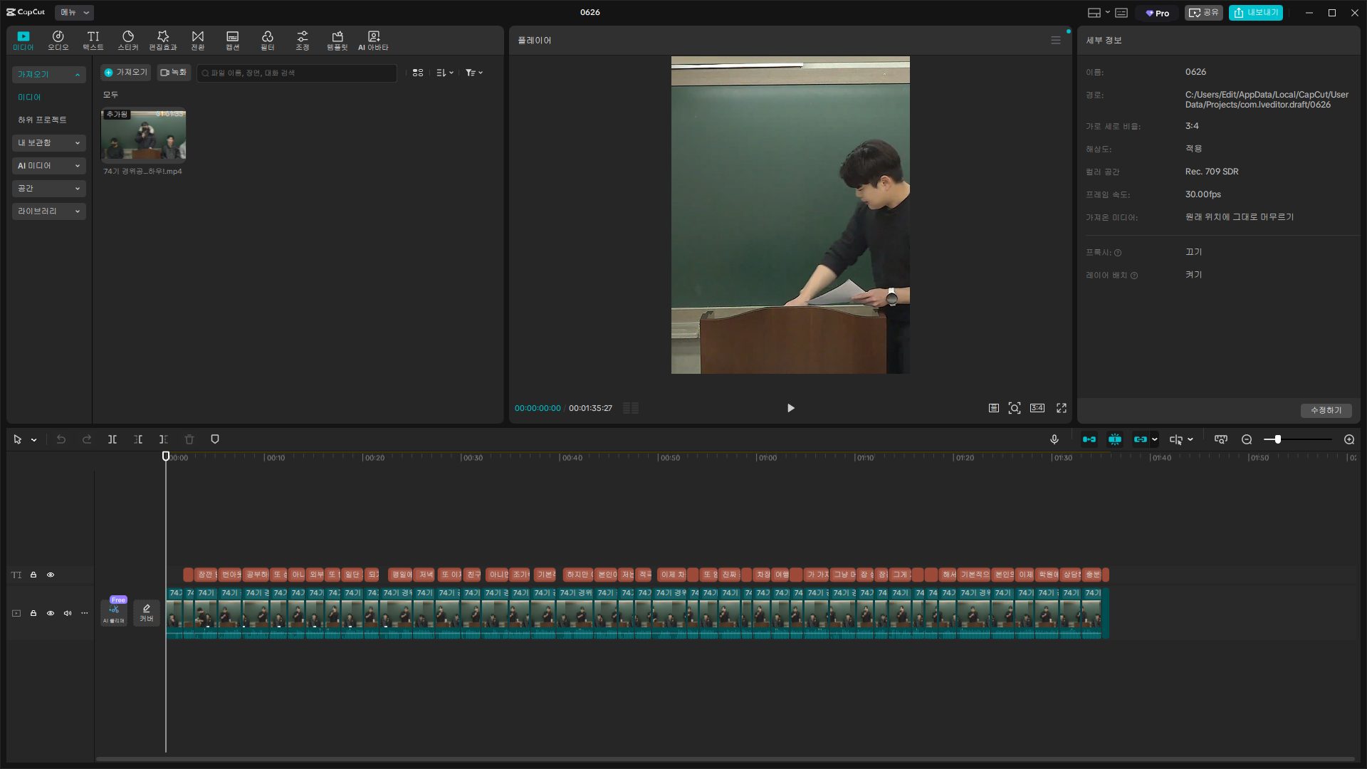 하지만 하나의 완성된 영상이 된 것이기때문에 이 영상을 다시 캡컷에 불러온다해도 수정하기란 쉽지 않습니다. 타임라인이 모두 다 하나로 저장이 된 것이기 때문입니다.