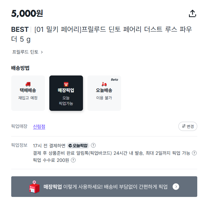 4. 매장픽업을 눌렀더니 '오늘 픽업가능'이라고 나옵니다.
