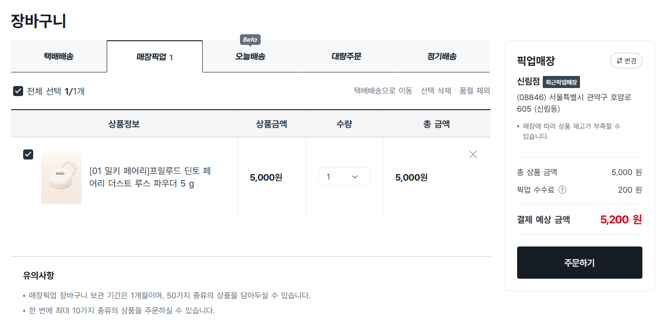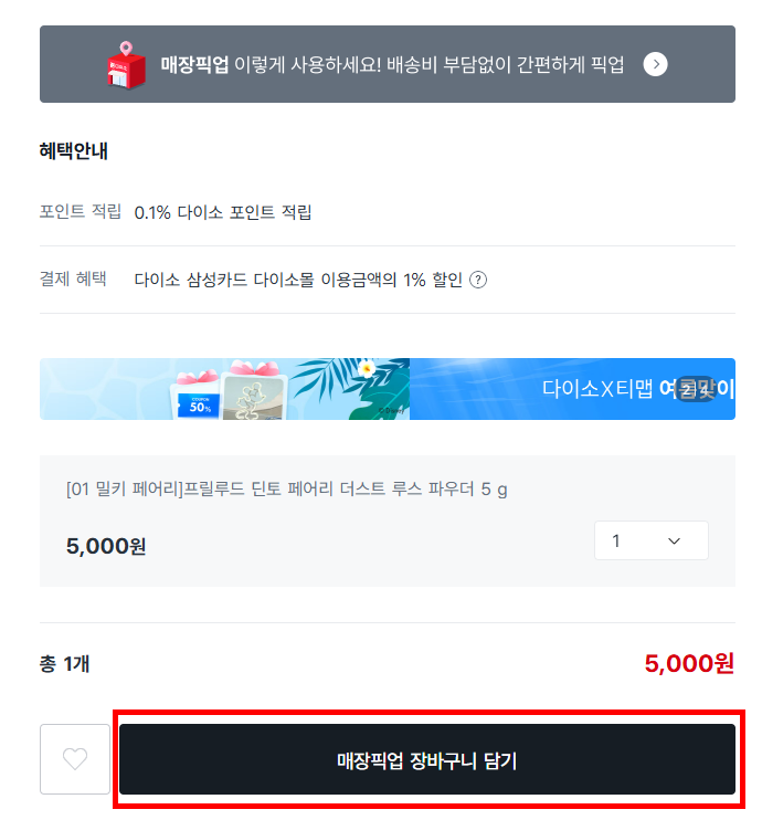 5. 매장픽업 장바구니 담기를 클릭해줍니다.