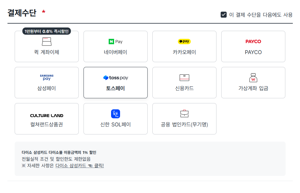 10. 결제 수단을 선택해주고 결제하기 버튼을 눌러줍니다.