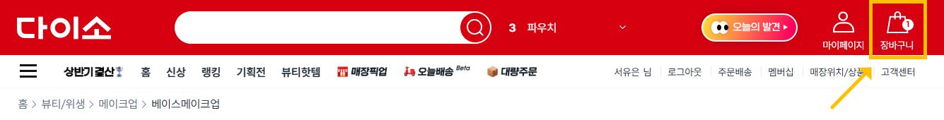 6. 화면을 맨 위로 올려 오른쪽 상단의 '장바구니'를 클릭해줍니다.