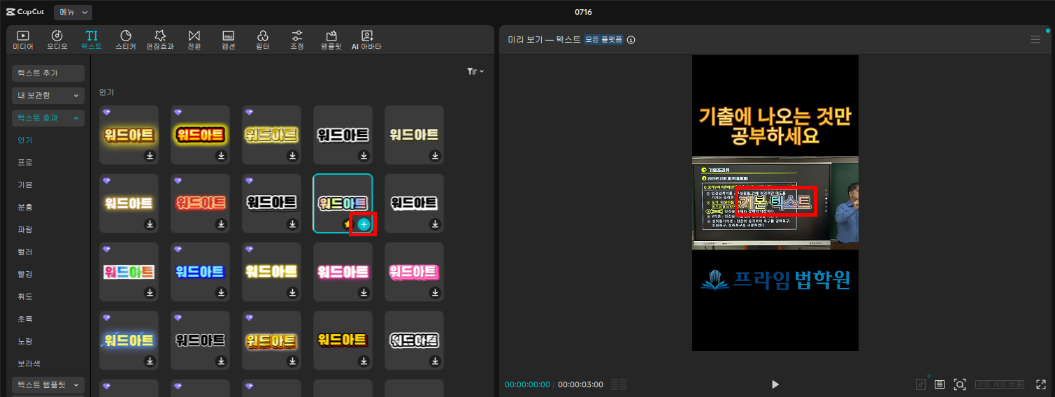 - 캡컷은 기본적으로 여러가지 효과가 넣어진 텍스트 효과를 써서 사용할 수 있습니다.