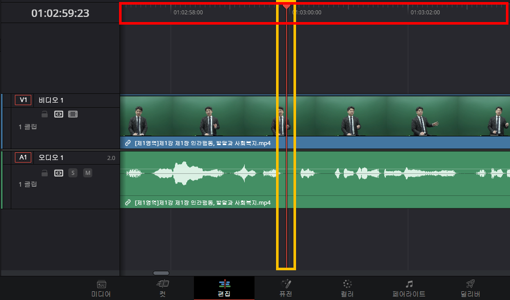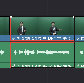 - 타임라인이 만들어지고 영상의 미리보기와 음성라인이 만들어졌습니다.