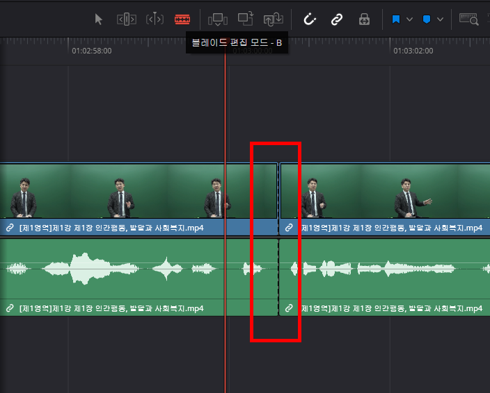 - 잘랐던 영상을 이어붙이기 해야겠죠, A를 누른 후 오른쪽 타임라인을 클릭해줍니다.