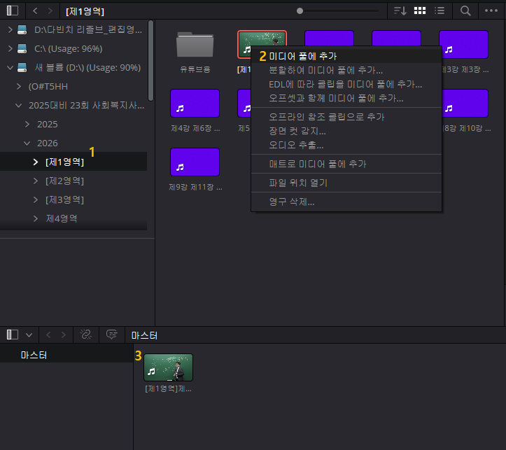 - 2번 영상을 '오른쪽 클릭'하여 '미디어 풀에 추가'를 눌러줍니다