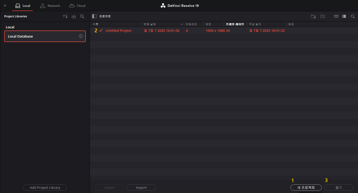- 1번 새 프로젝트 버튼을 누른 후 프로젝트를 만드세요